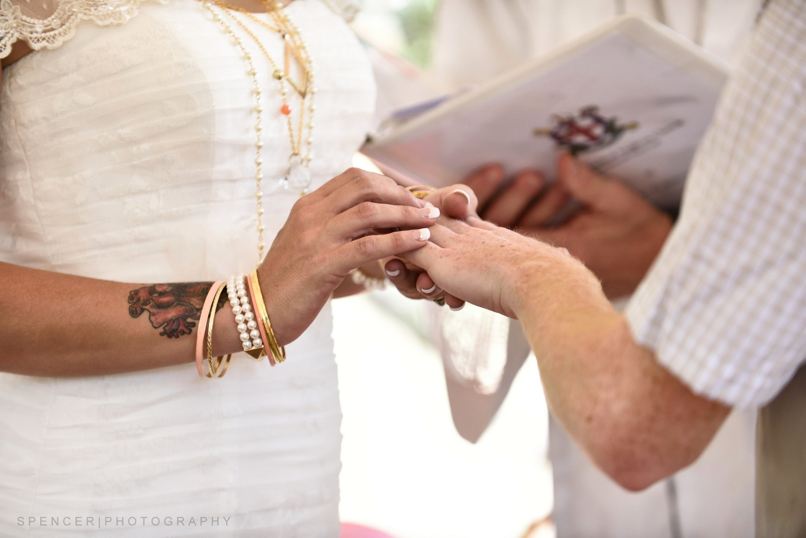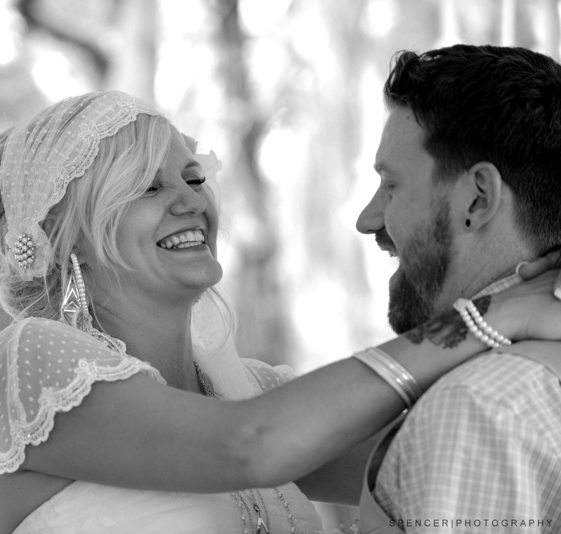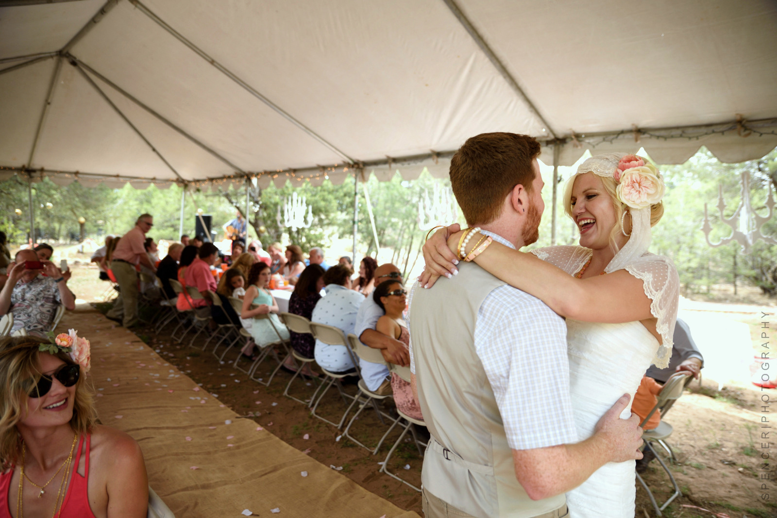 As friends and family took their seats, an acoustic guitarist sat off to the side and played quietly waiting for the Bride. Escorted by her father, she completed her walk down the pine cone decorated isle to meet her future husband under the alter made from fallen branches, leaves and other foliage gathered from the surrounding scape. Friends and family sat quietly as they exchanged their vows.